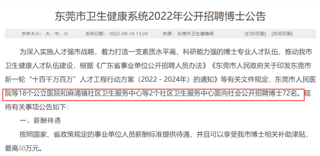 去年九月,东莞市卫生健康系统 2022 年公开招聘博士公告中显示——「东莞市人民医院等 18 个公立医院和马永贞社区卫生服务中心等 2 个社区卫生服务中心面向社会公开招聘博士 72 名。」