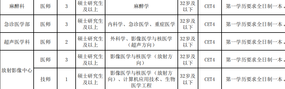 基础学历要求为全日制一本,基础学历专业要求为临床医学或招聘岗位要求专业方向。