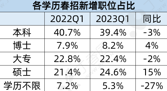 今年春招,硕士岗位同比去年占比幅度增加 15 个点 ,而本科岗位占比下降 3 个点。对于一些不限学历的岗位,占比更是下降了 27%。
