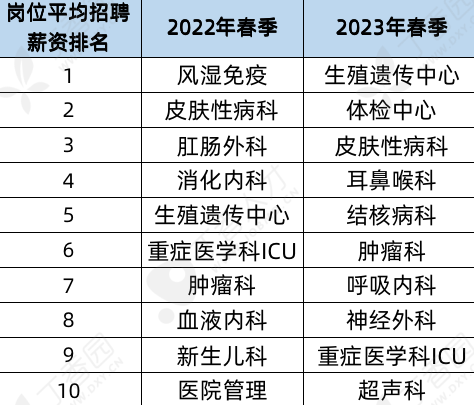 检验科作为疫情管控的坚实后盾之一,在管控放开后,随着对于核酸检测需求的下降,检验岗位的发布量也随之下降。十大薪资最高科室 生殖科领跑,平均月薪 1.8 万 点击查看医院科室薪资情况根据丁香人才春招发布岗位显示,薪资最高的科室是生殖遗传科,紧随其后的分别为体检中心和皮肤性病科。