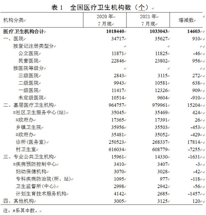 根据国家卫健委发布的数据显示,截至 2021 年 7 月底,全国医疗卫生机构数为 1013.3 万个。与 2020 年同期比较,全国医疗卫生机构增加 14603 个,其中:医院增加 910 个,基层医疗卫生机构增加 15204 个。在增加的定级医院中,二三级医院增加 910 个(272+638)。