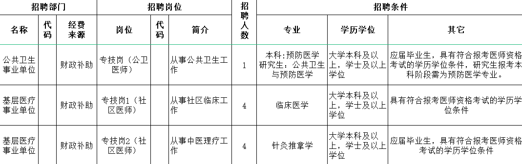 具体招聘的岗位、条件及人数详见《2023 年天津市北辰区卫健系统公共卫生及基层医疗单位公开招聘卫生专业事业编人员岗位表》。