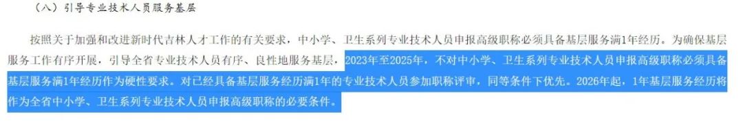 为确保基层服务工作有序开展,引导全省专业技术人员有序、良性地服务基层,2023 年至 2025 年,不对中小学、卫生系列专业技术人员申报高级职称必须具备基层服务满 1 年经历作为硬性要求。