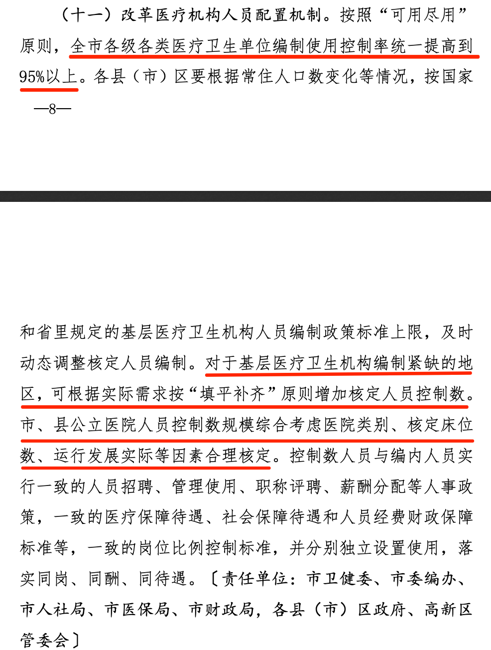 改革医疗机构人员配置机制。按照「可用尽用」原则,全市各级各类医疗卫生单位编制使用控制率统一提高到 95% 以上。各县(市)区要根据常住人口数变化等情况,按国家和省里规定的基层医疗卫生机构人员编制政策标准上限,及时动态调整核定人员编制。