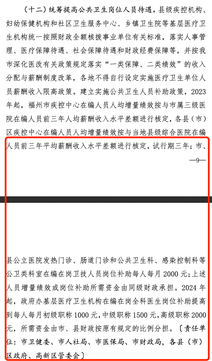 此外,文件中还提到,市、 县公立医院发热门诊、肠道门诊和公共卫生科、感染控制科等公卫类科室在编在岗卫技人员岗位补助每人每月 2000 元;上述人员增量绩效或岗位补助所需资金由同级财政承担。
