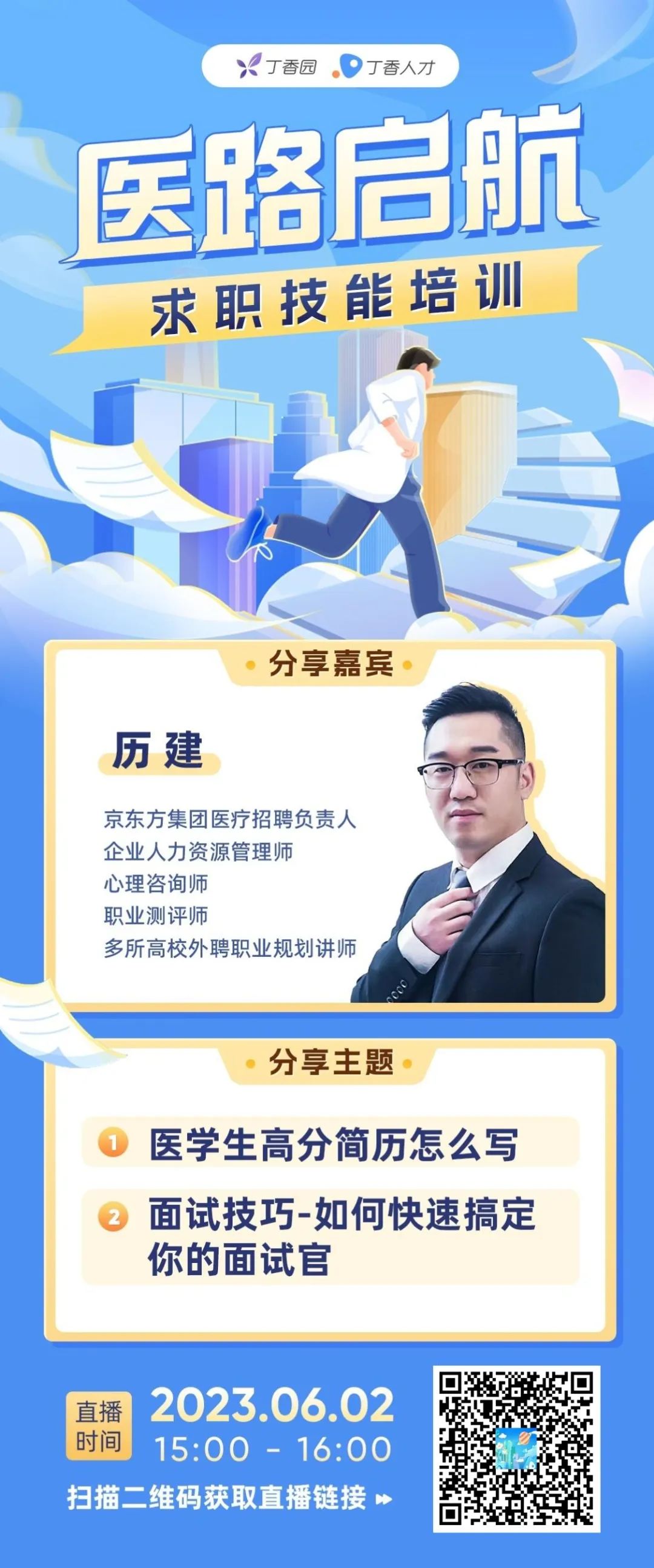 所以丁香园特别邀请了 京东方集团医疗招聘负责人、企业人力资源管理师历建老师 在 2023 年 6 月 2 日(周五)15:00 直播进行求职技能培训,包括简历制作、面试指导等,分享自己作为 HR 的建议。