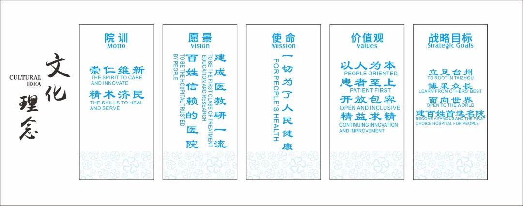 文化建设医院重视文化建设,围绕院训、愿景、使命、价值观和战略目标等核心文化, 积极宣传引导,推行有温度的医疗,增强员工的凝聚力和向心力。