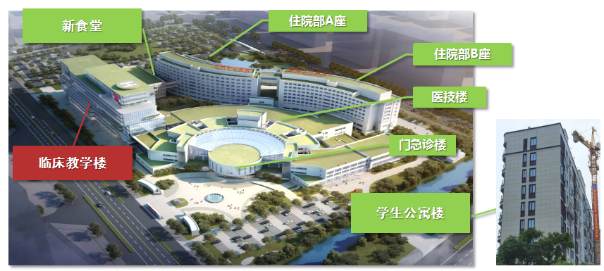 医院规划在市委市政府大力支持下,医院通过总规调整,「十三五」期间完成了急诊加扩建工程建设,「十四五」期间已完成学生宿舍及食堂大楼建设,健康与临床教学大楼建设目前正在推进中。