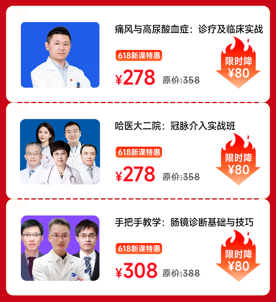痛风诊疗、冠脉介入、肠镜诊断新课特享 618 专属优惠,直降 80 元 !