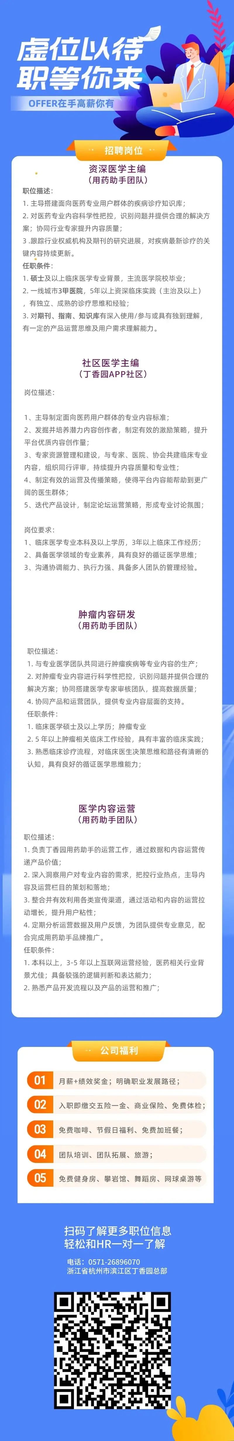 我们期待你的加入!不要犹豫,抓紧时间投出你的简历吧!👇👇👇将简历投至邮箱chenfangfang@dxy.cn邮件标题:岗位名称 - 姓名