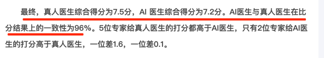 最终,真人医生比 AI 医生多得分 0.3 分略胜一筹(7.5 分 VS 7.2 分)。