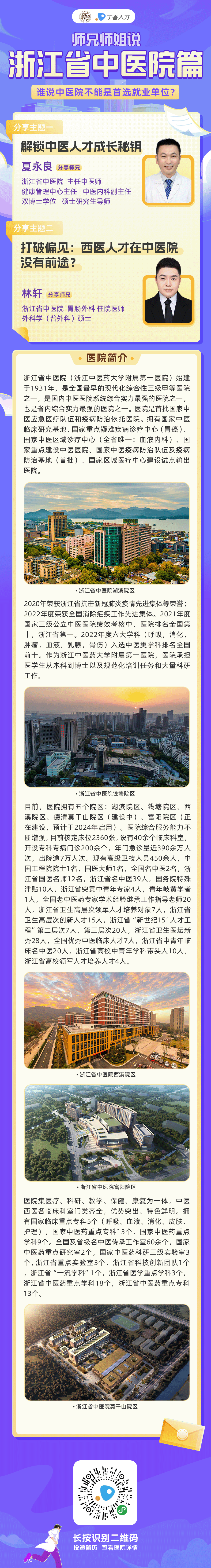 2024 届校招预热|浙江省中医院师兄师姐说日期:2023-07-06 来源:丁香人才公众号「 宣讲会时间 」 浙江省中医院师兄师姐说 时间:2023-07-06(周四)18:30~19:30 点击预约直播 微信扫一扫分享资讯上一篇:联勤保障部队北部地区招聘 748 人下一篇:三级综合新建医院 | 贵州茅台医院诚邀您的加入