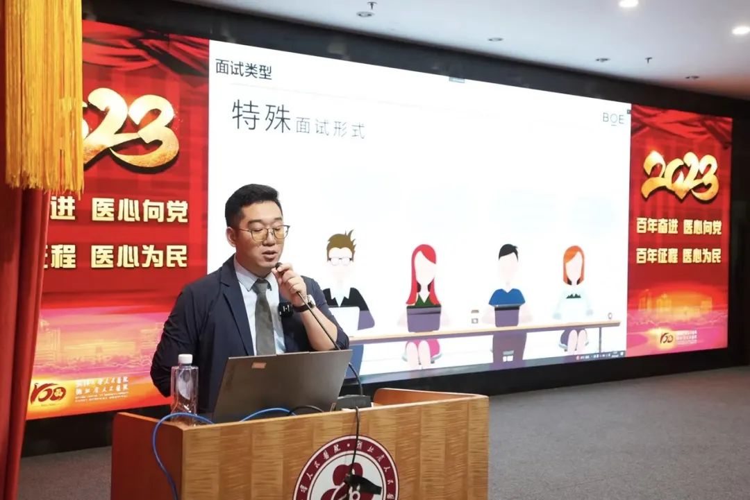 2023 年 6 月 2 日下午,为更好地服务即将毕业的学生,丁香园联合武汉大学医学部,由武汉大学第一临床学院主办,邀请了京东方集团医疗校园招聘负责人历建老师为同学们带来《医路起航—求职技能培训》的求职技能专题讲座。