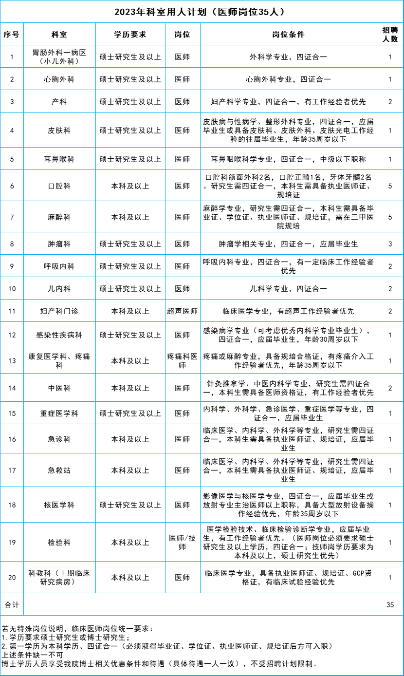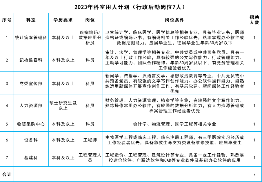 3、学历要求:医药护技岗位学历要求按各科室招聘需求执行;行政后勤类本科招聘岗位必须为「双一流」高校毕业生。