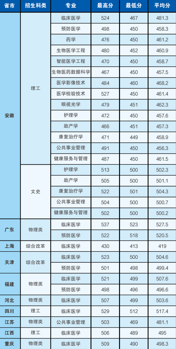 在 2022 年各省市本科招生中,安徽医科大学临床医学院专业分数线基本控制在本科二批及以上。