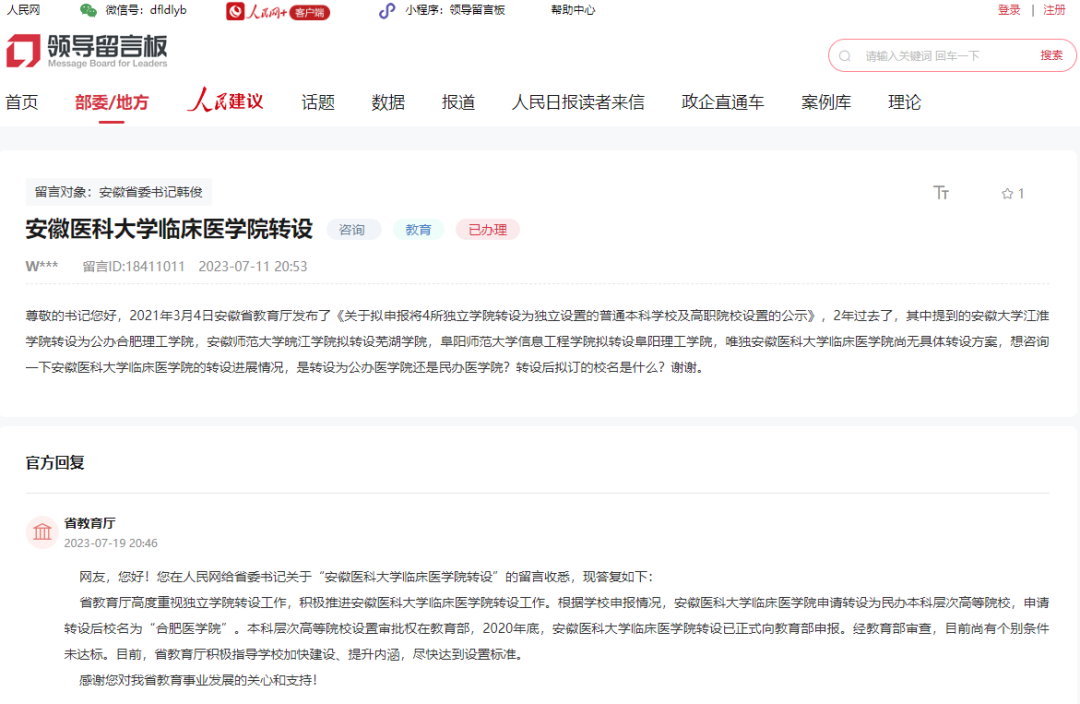 该网友提出,早在 2021 年安徽省教育厅发布的《关于拟申报将 4 所独立学院转设为独立设置的普通本科学校及高职院校设置的公示》中,就提到了安徽医科大学临床医学院转设的相关信息,如今尚无具体方案。想咨询一下转设进展情况。