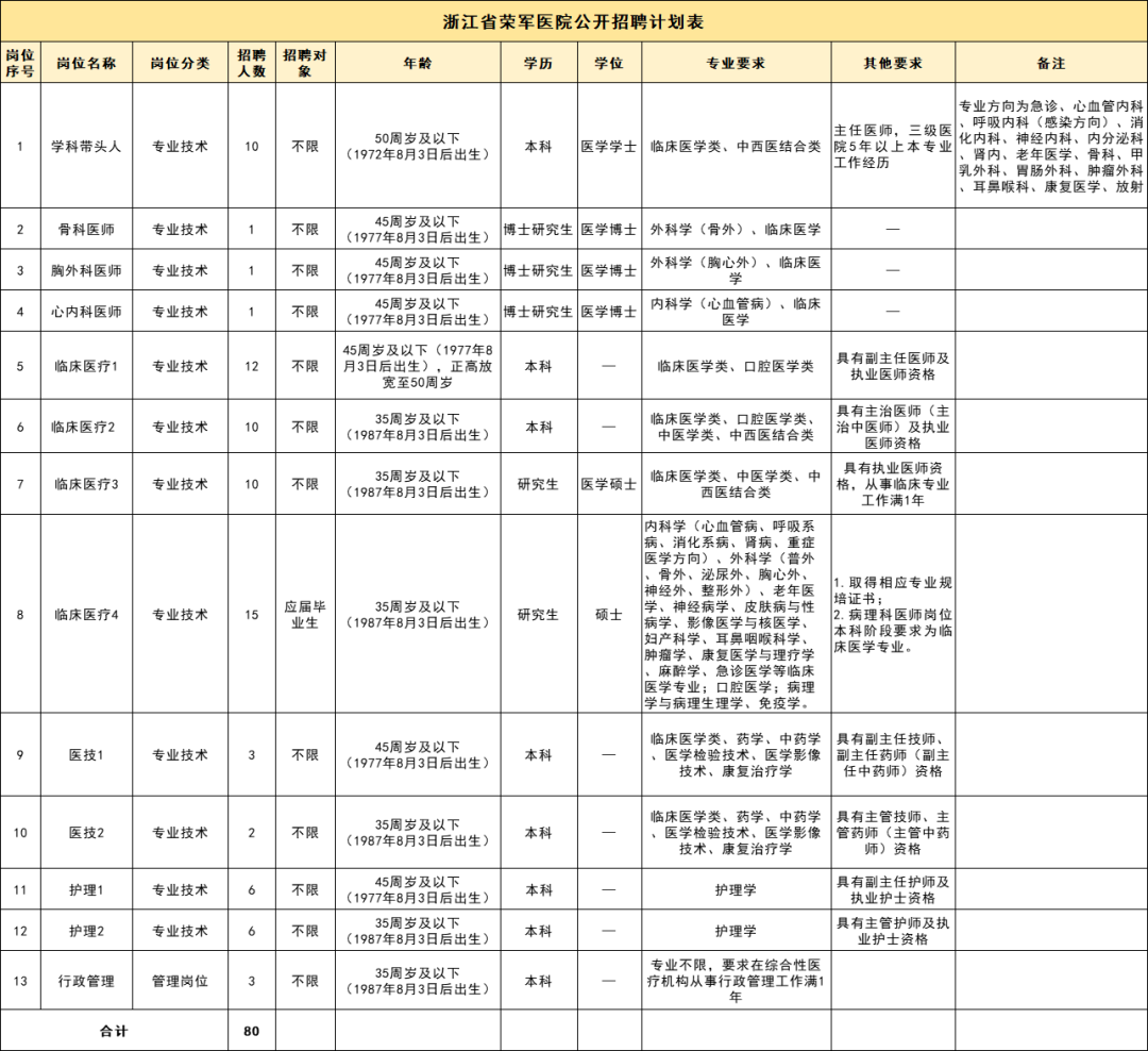 本批次招聘需求为 13 个岗位共 80 人,具体要求见招聘计划表(下表)。