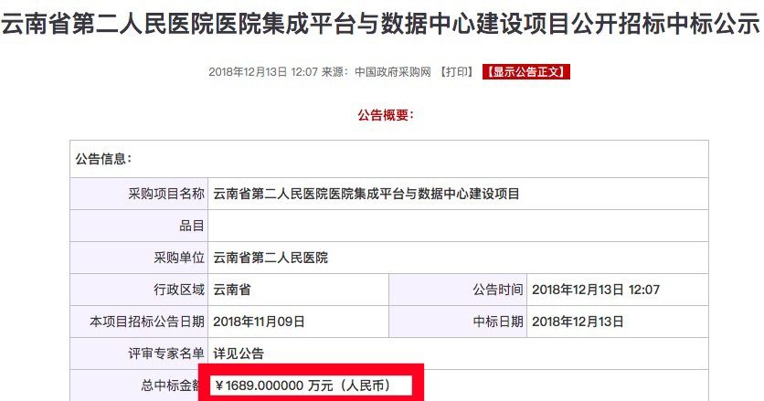 根据中国政府采购网的招标数据中,我们可以看到 2018 年部分医院信息集成平台的产品采购价格。根据医院规模的不同,价格从几百万到上千万不等。