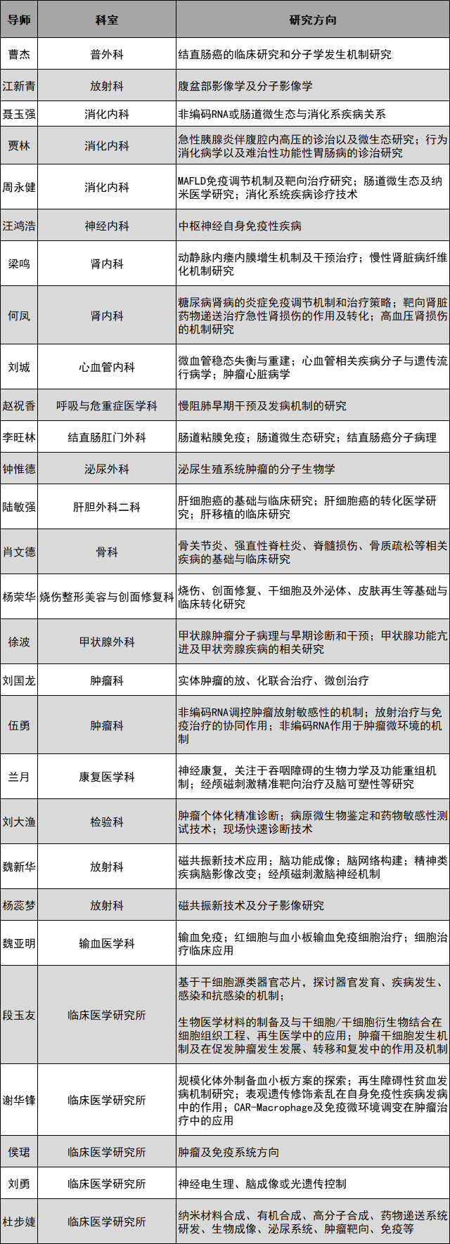 招聘学科范围:普外科、放射科、消化内科、神经内科、肾内科、心血管内科、呼吸与危重症医学科、结直肠肛门外科、泌尿外科、肝胆外科、骨科、烧伤整形美容与创面修复科、甲状腺外科、肿瘤科、康复医学科、检验科、放射科、输血医学科、临床医学研究所。具体导师及研究方向见下表: