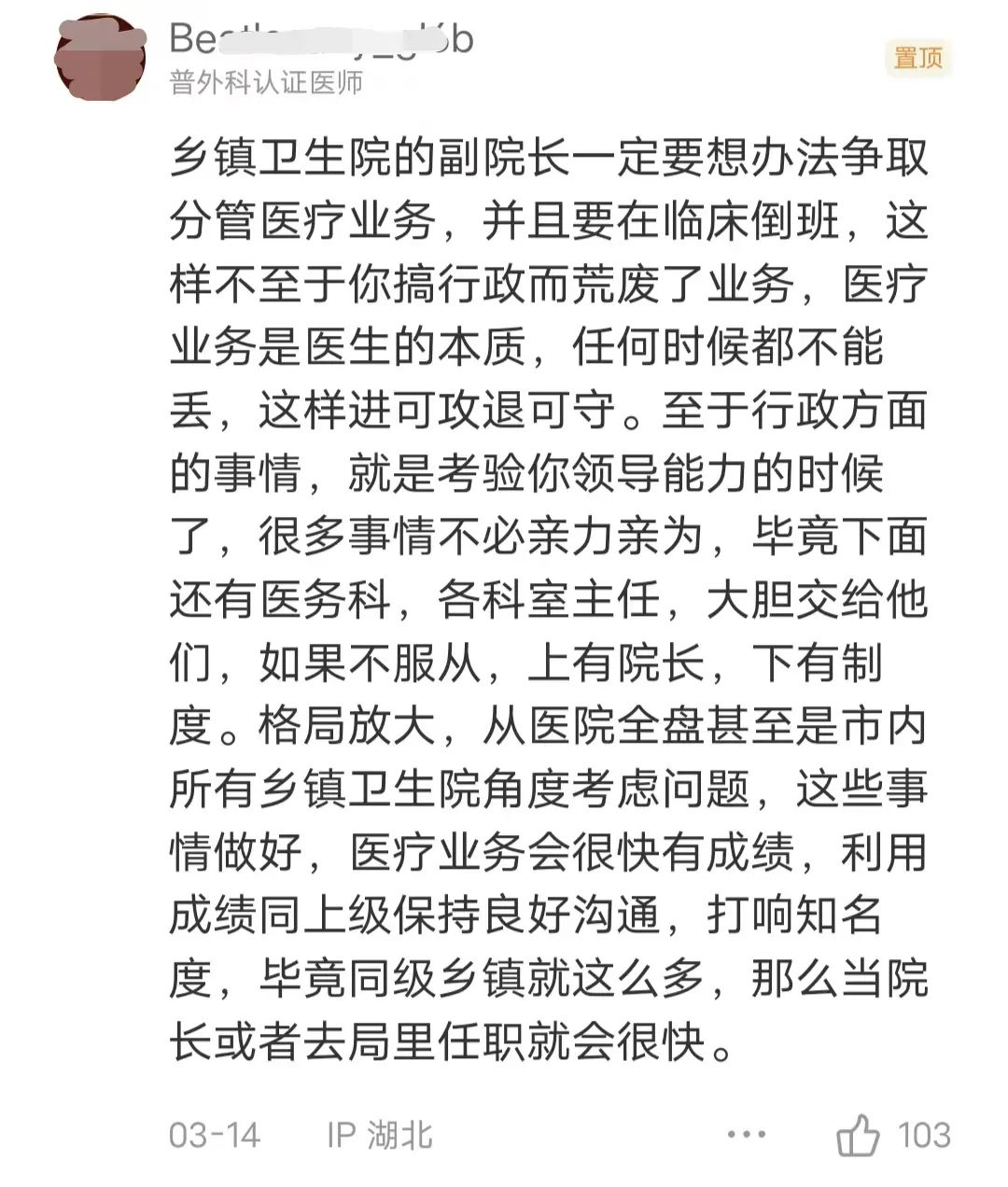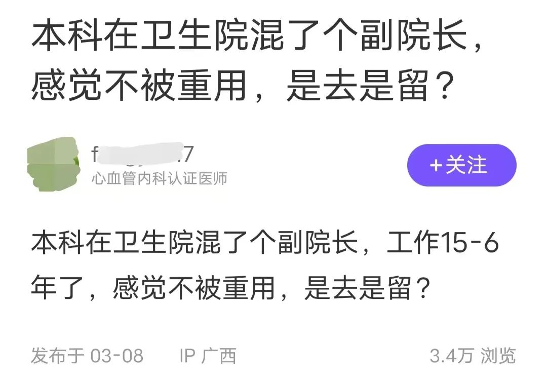 站友 @f***7 在丁香园社区发帖求助, 他自述本科学历在卫生院当了副院长,工作 16 年了,却感觉不被重用,是去是留?点击查看原帖详情>>>