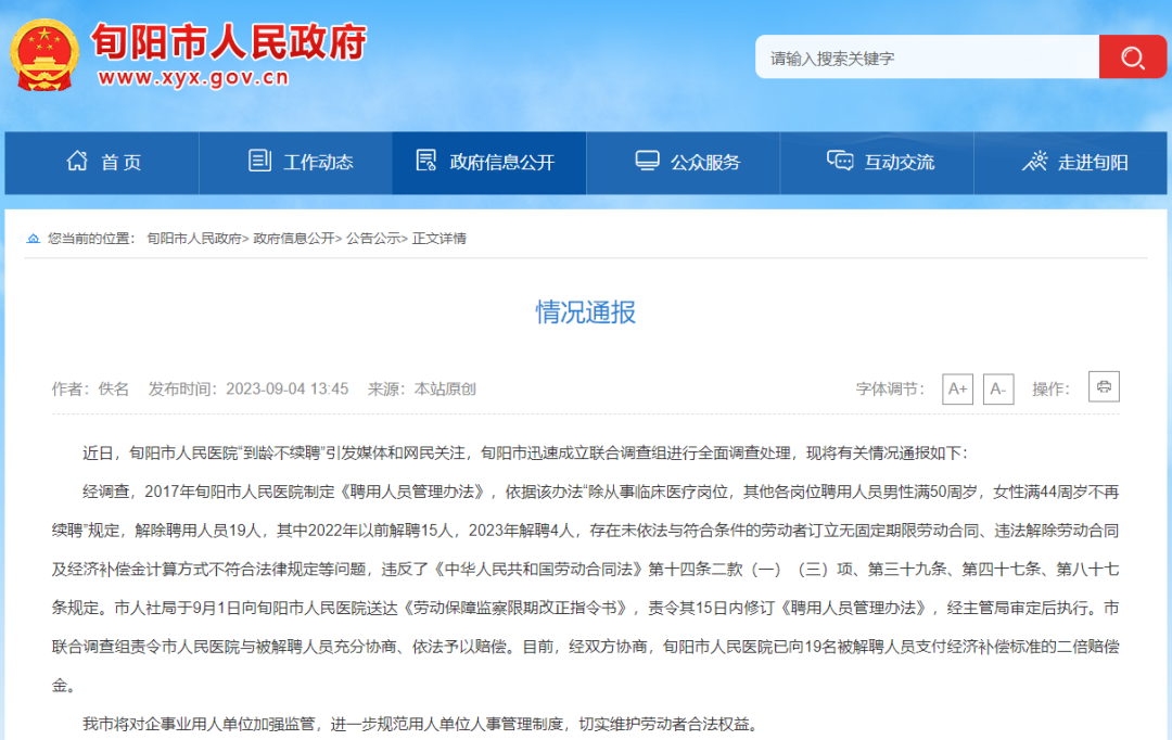 阳市 人民政府官网,近日,旬阳市人民医院「到龄不续聘」引发媒体和网民关注,对此旬阳市迅速成立联合调查组进行全面调查处理,并将有关情况通报如下: