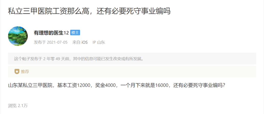 公立医院最大的优势在于「稳定」,工资架构比较固定,基本生活有保障。其实,我跳槽去民营医院,并不是因为公立医院不好,可能是我不太适应体制内的环境吧。为此,我也去丁香园论坛搜了一下这方面的帖子,发现了有些小伙伴与我有类似的想法。