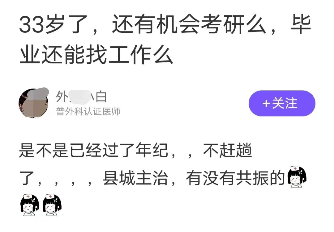 站友 @外***白 近期在丁香园社区发帖提问:自己目前 33 岁,是县城医院主治,是否还有机会考研?毕业后找工作是否会困难? 点击查看原帖详情>>>
