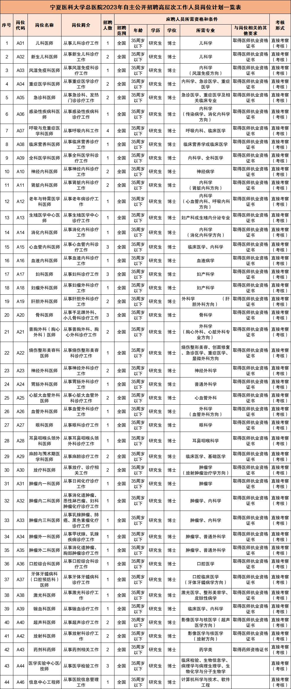宁夏医科大学总医院 发布 2023 年公开招聘公告宁夏医科大学总医院前身是 1935 年由宁夏卫生实验处(宁夏回族自治区卫生厅前身)负责组建的宁夏省立医院。1951 年更名为宁夏省人民医院;1954 年更名为甘肃省第二人民医院;1958 年更名为宁夏回族自治区人民医院;1962 年更名为宁夏回族自治区第一人民医院;1973 年更名为宁夏医学院附属医院;2008 年更名为宁夏医科大学附属医院;2010 年更名为宁夏医科大学总医院。