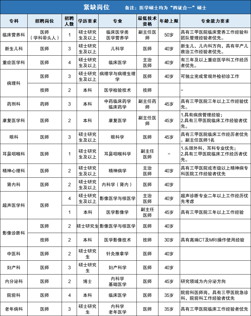 往届本硕博毕业生(病理科、药剂科、重症医学科、新生儿科、超声医学科等紧缺科室岗位、中级职称、已完成住院医师规培者优先考虑)。