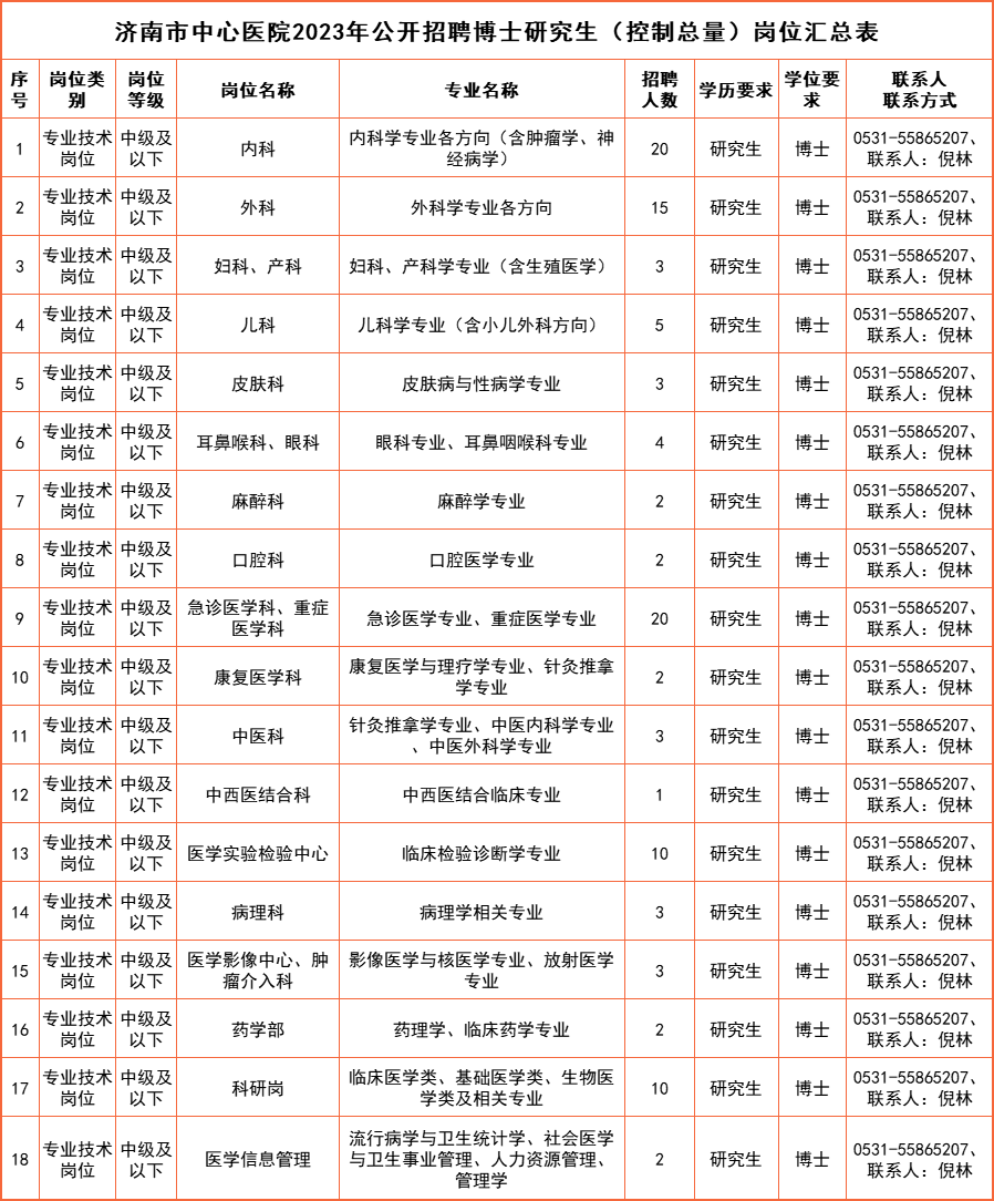 济南中心医院计划招聘博士研究生 110 人 (岗位计划见下图)。