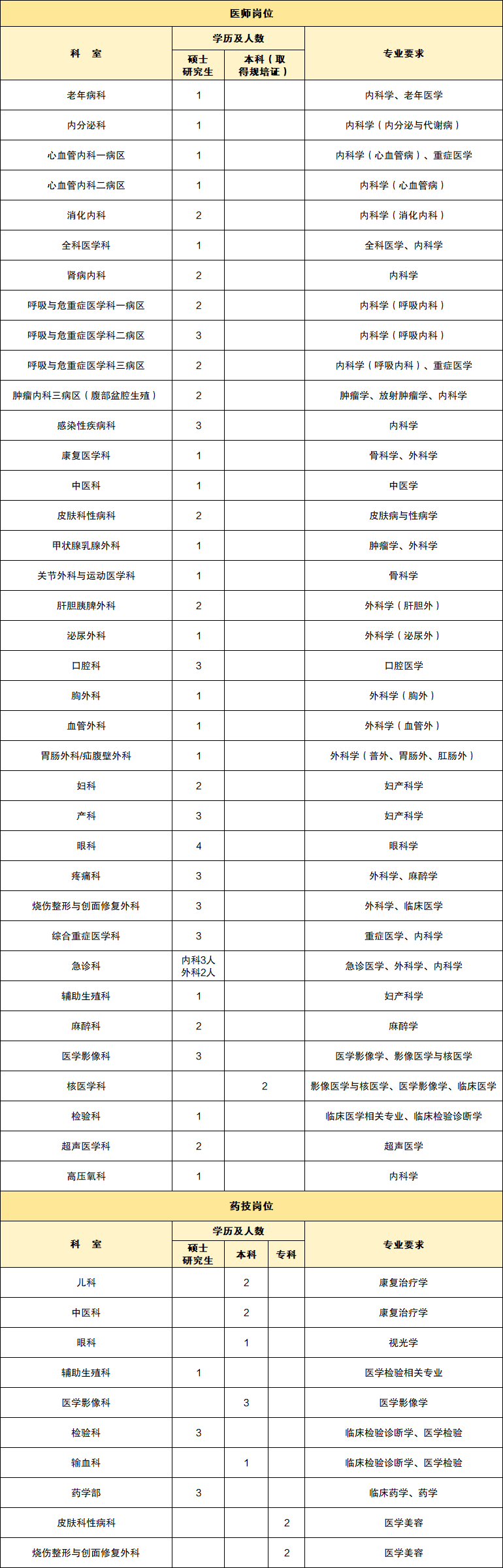 临床医师、医技人员要求 35 周岁以下,特别优秀者可酌情放宽条件;护理人员要求为应届毕业生,30 周岁以下,硕士研究生及以上学历者可放宽年龄条件。