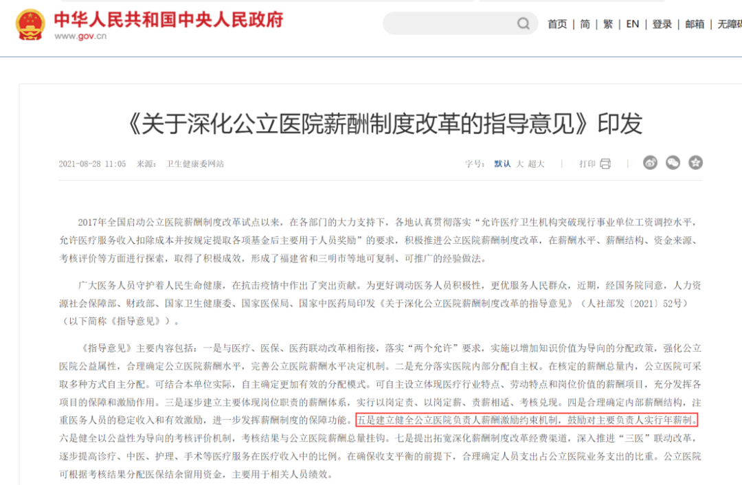 早在 2021 年,国家卫生健康委员会就正式印发了《关于深化公立医院薪酬制度改革的指导意见》,明确提出:合理确定内部薪酬结构,注重医务人员的稳定收入和有效激励,进一步发挥薪酬制度的保障功能。同时,也要建立健全公立医院负责人薪酬激励约束机制,鼓励对主要负责人实行年薪制