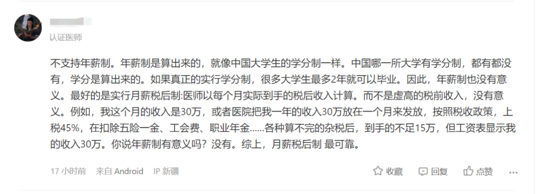还有人说,建议实行「月薪税后制」,提倡以每个月医师实际到手的税后收入进行计算。