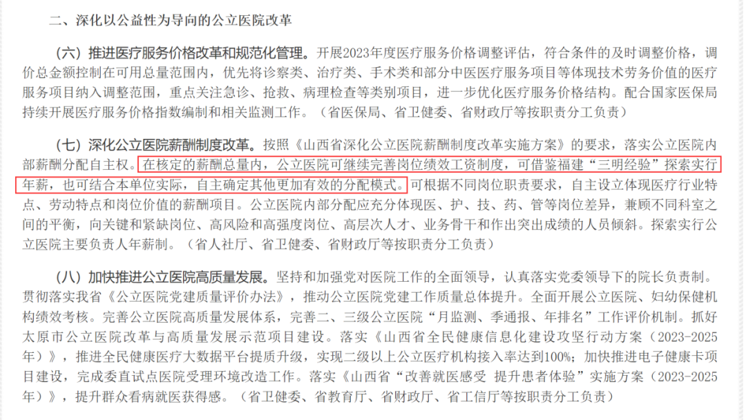 为了进一步深化以公益性为导向的公立医院改革,2023 年 10 月 23 日,山西省卫生健康委员会联合多部门联合正式印发了《山西省深化医药卫生体制改革近期重点工作任务》的通知。