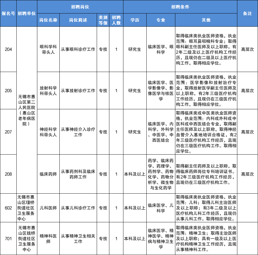 为进一步加强惠山区卫生健康人才队伍建设,根据《江苏省事业单位公开招聘人员办法》(苏办发〔2020〕9 号)文件精神,无锡市惠山区卫生健康系统决定面向社会公开招聘高层次人才、紧缺型事业编制卫技人才 29 名,普通类事业编制工作人员 31 名(详细岗位见附件 1)。现将有关事项公告如下: