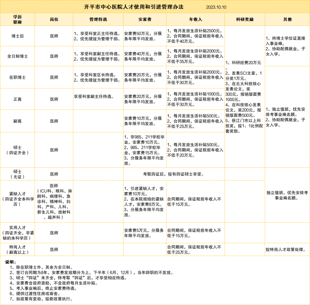 薪酬待遇从优,享受五险二金、年度体检和其他福利;提供科研经费,设科研、论文、专利、专著等额外奖励;提供国内进修、访问、交流、规培等机会;对拔尖、紧缺等人才,可协商享受「一人一策」特殊待遇。