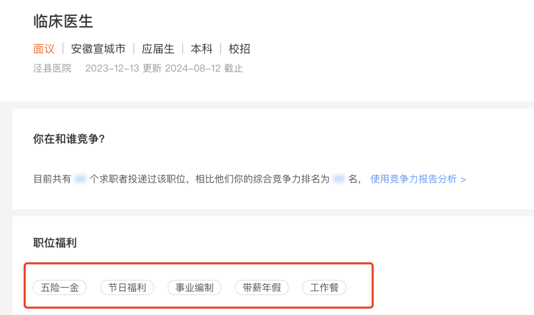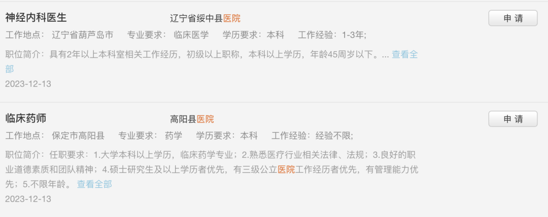 在丁香人才网,县医院的招聘学历以本科为主,对工作经验也没有严格的要求,部分县医院五险一金全、还有入编机会。