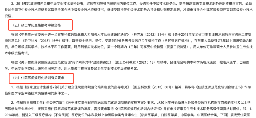 在贵州省卫健委《关于 2024 年卫生专业技术资格考试有关工作的通知》公布的报名条件中,规定硕士学历、住培合格的本科学历临床医师都可以直接报考中级:
