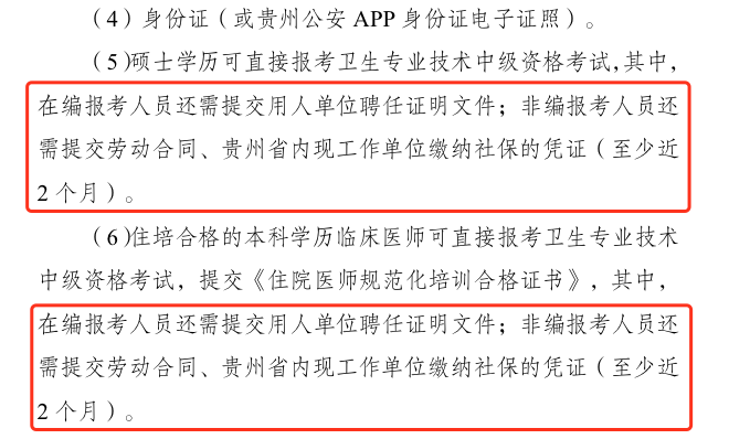 不过,贵州省卫健委这则通知的附件中对以上两种情况需要提交的报名材料做了详细的规定,除了学历证书、医师资格证等常规证明外,还需要提交用人单位聘任证明文件、劳动合同、至少近 2 个月的社保凭证等。