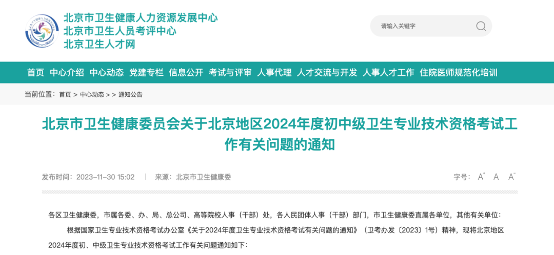 11 月 30 日,北京市卫生健康委员会发布了《关于 2024 年度卫生专业技术资格考试有关问题的通知》,指出: