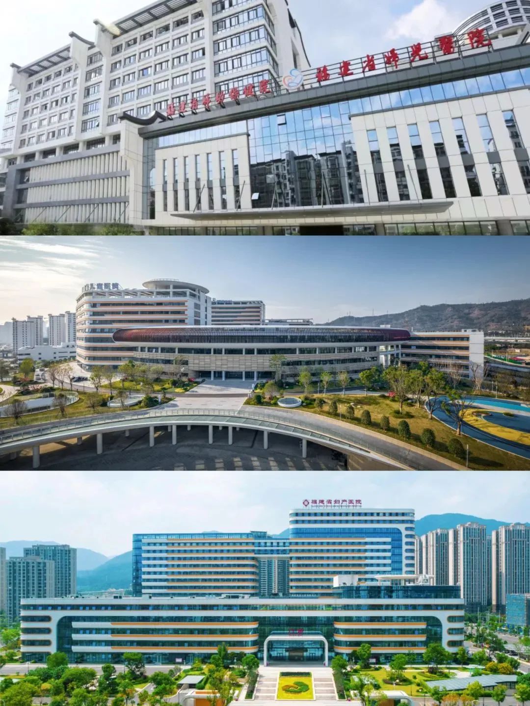 福建省妇幼保健院 位于福州市鼓楼区道山路 18 号,始建于 1935 年,建筑面积 8.97 万平方米,编制床位 1,000 张,为全国首家三级甲等妇幼保健院,全国首批爱婴医院、公立医院高质量发展省级示范医院。 国家区域医疗中心上海交通大学医学院附属上海儿童医学中心福建医院(福建省儿童医院) 位于福州市晋安区横屿路 966 号,占地面积 233 亩,建筑面积 22.7 万平方米,编制床位 1,000 张,总投资 33 亿元。2020 年 12 月开诊运营,2021 年医院获批「第二批国家区域医疗中心试点项目」。 福建省妇幼保健院五四北院区(福建省妇产医院) 位于福州市晋安区坂中路 568 号,建筑面积 17.7 万平方米,编制床位 800 张,总投资金额 23.24 亿元。2021 年 11 月医院正式开诊运营。三院协同发展,始终秉承「厚德精术、仁泽妇幼」的院训精神,坚守「一切为了妇儿健康」的使命,致力打造国内领先的高质量研究型妇儿专科医院,为人民群众提供集医疗、保健、教学、科研于一体的一流的全生命周期健康服务。在 2021 年 国家三级公立医院绩效考核 中位列妇产专科系列 全国第 7、全省第 1 ;在 2022 年国家三级妇幼保健院绩效考核 中位列 全国第 10、全省第 1