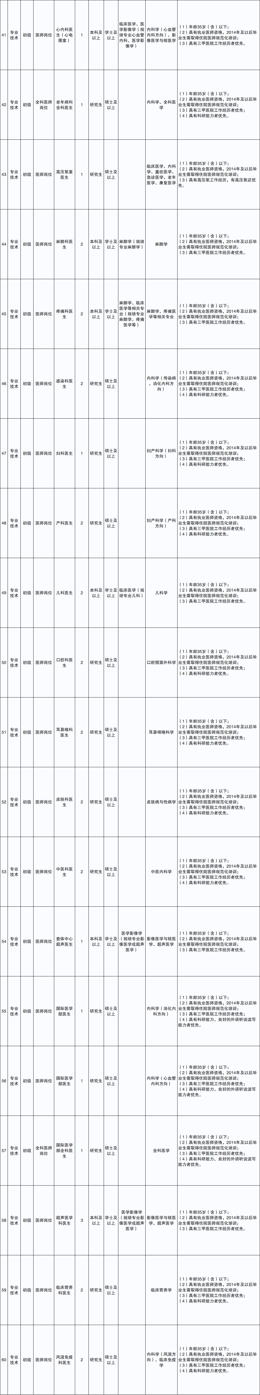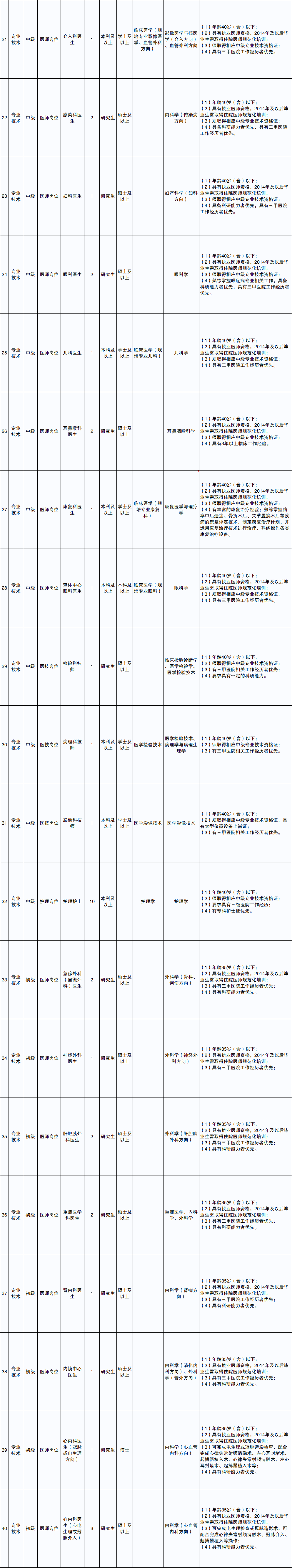 (5)40 周岁(含)以下、具有博士学位或硕士研究生且具有中级专业技术资格;或 45 周岁(含)以下、博士学位且具有中级专业技术资格;或 50 周岁(含)以下、具有研究生学历及硕士学位且具有副高级专业技术资格;或 55 周岁(含)以下、具有研究生学历及硕士学位且具有正高级专业技术资格,且与我院重点学科、专科发展相关的急需紧缺专业中青年人才。
