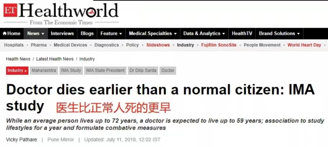 印度医生协会(IMA)曾经做过一项研究,结果发现,医生的平均寿命为 59 岁,远远低于普通人的平均寿命 72 岁。