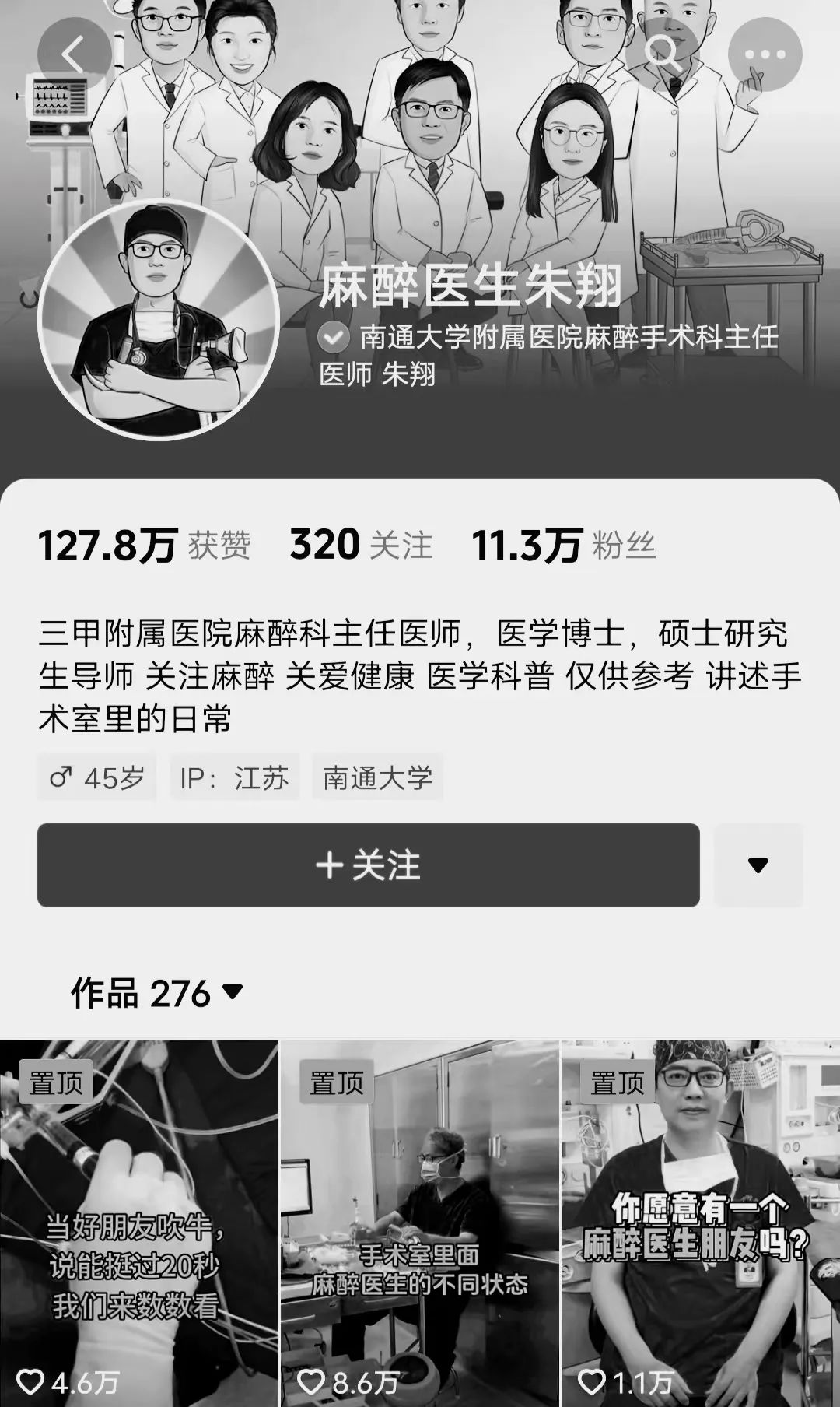 平日里,朱翔主任还有自己的自媒体账号,在上面进行健康科普,为广大人民群众揭开手术室的神秘面纱,仅在某一个平台上就有 276 个科普作品,11 万多的粉丝。
