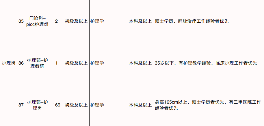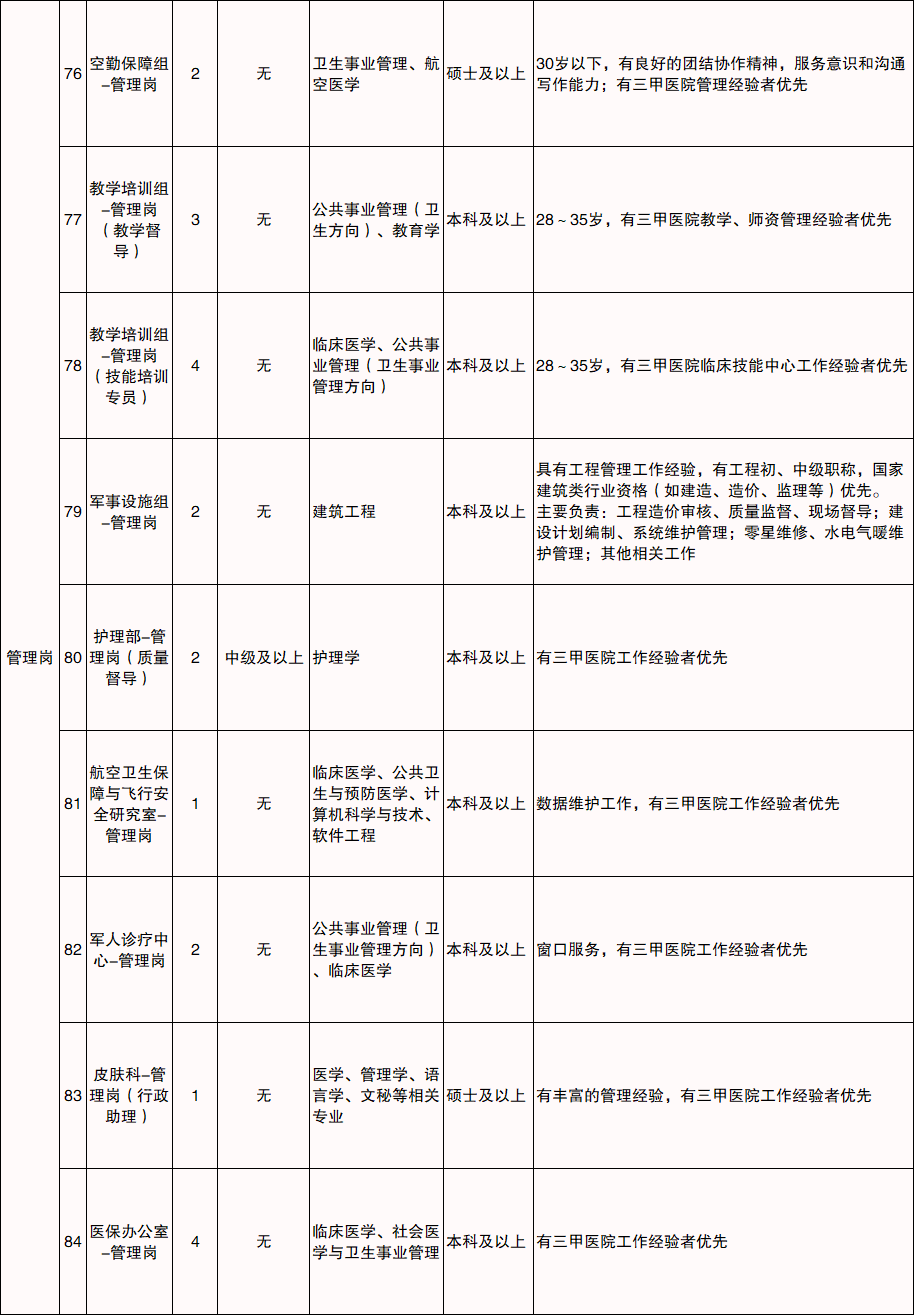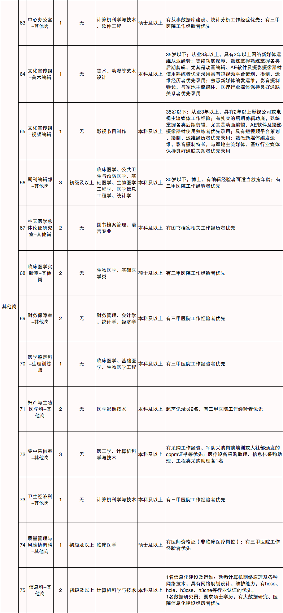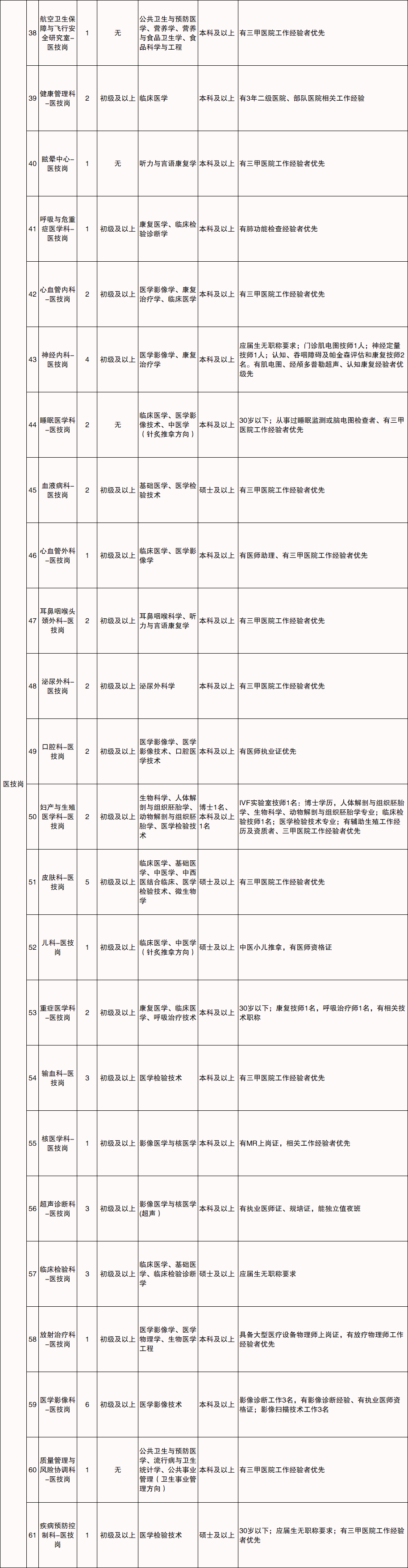 医疗岗硕士以上学历,医技等其他岗位本科以上学历;具有博士学历学位人员优先。