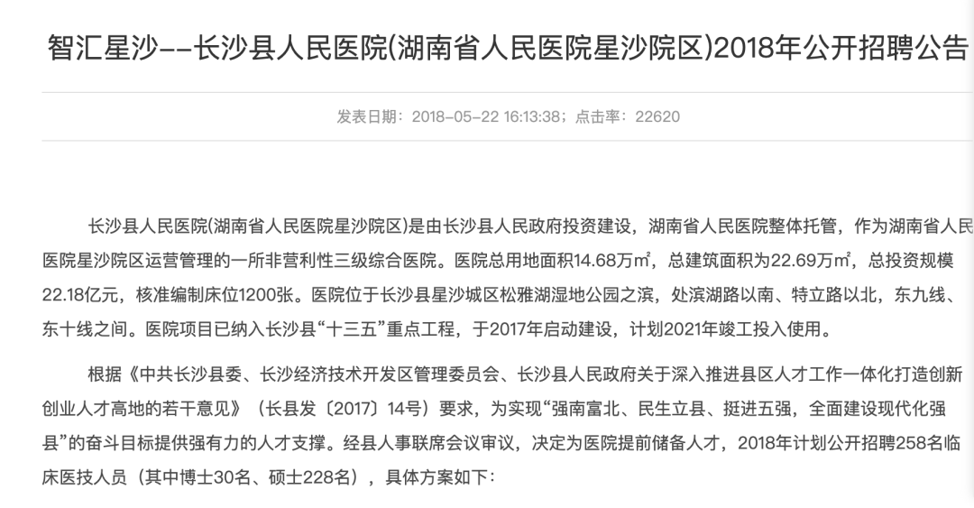 在 2018 年湖南省人民医院发布的招聘简章中显示,长沙县人民医院是该县的「十三五」重点工程,计划在 2021 年竣工投入使用。