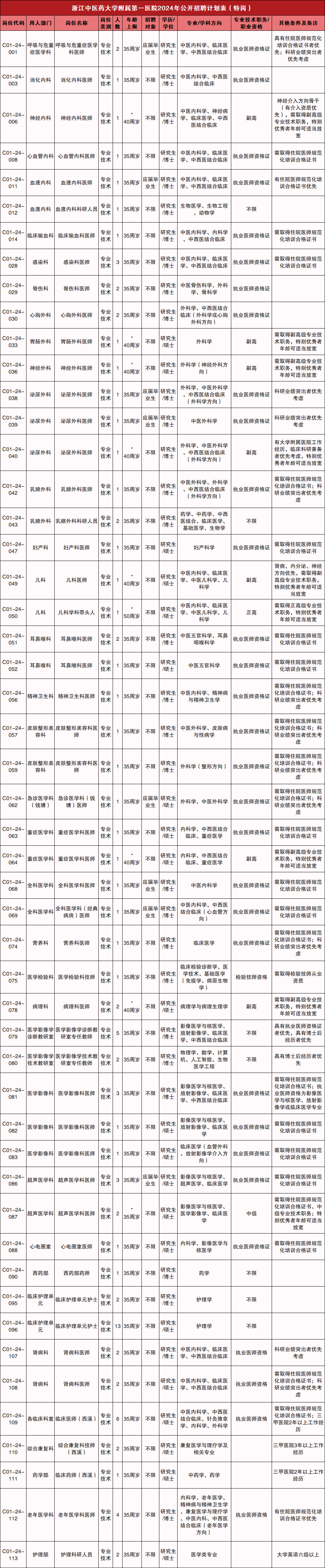 招聘岗位、人数及具体要求详见《浙江中医药大学附属第一医院 2024 年度特殊专业技术岗位招聘岗位表》。