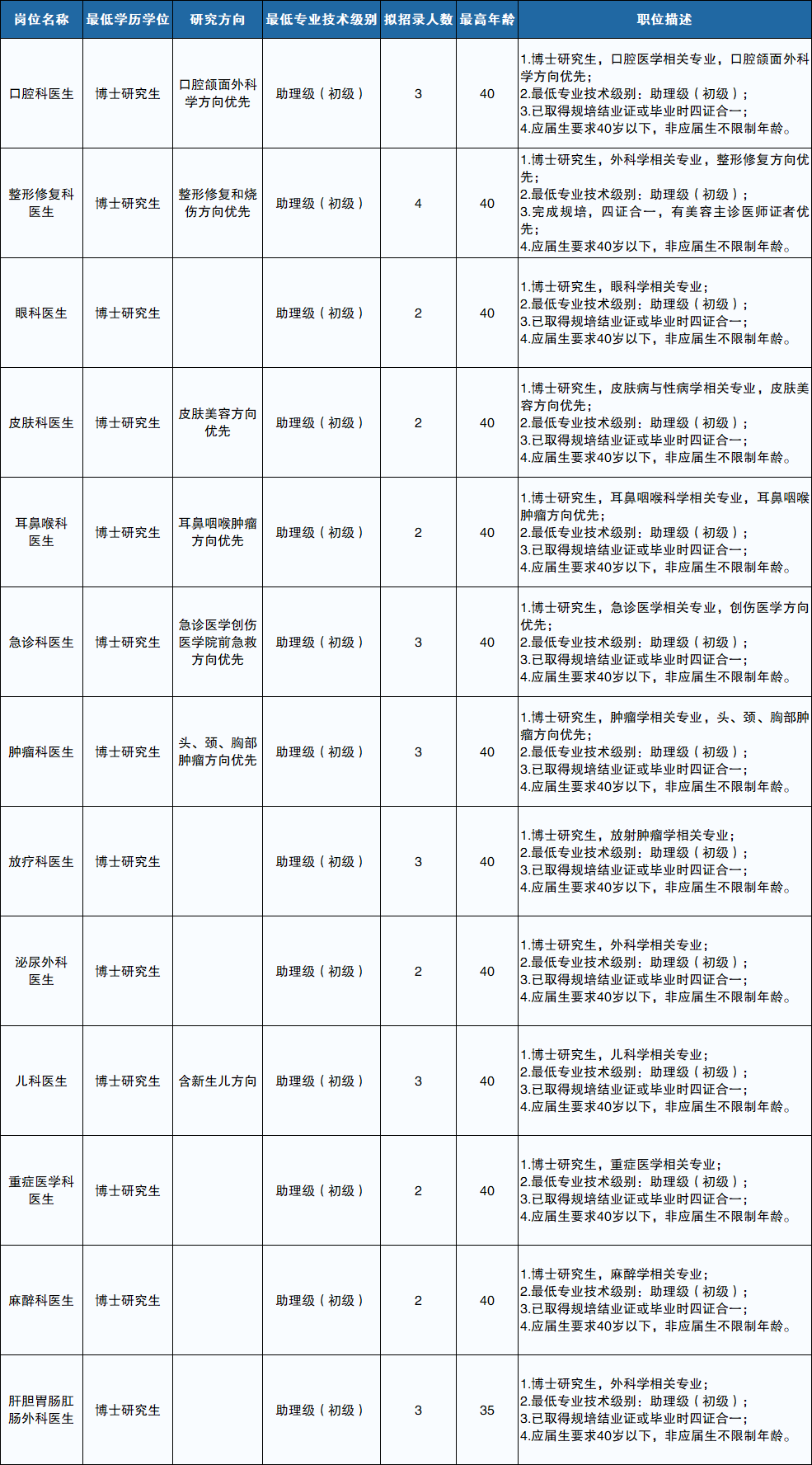 医院着力发展三大专业学科群,重点打造以创伤骨科为核心的急诊 ICU 学科群,以整形修复为核心的眼耳鼻喉口腔皮肤整形修复学科群,以肿瘤(放疗)为核心的肿瘤内外科学科群。整形修复科、耳鼻喉科按照国家级重点专科规划,省级重点专科推出,拟引进国家级重点专科主任/副主任负责学科规划和建设。肿瘤科、创伤骨科按照省级重点专科规划,市级重点专科推出,拟引进省级重点专科主任/副主任负责学科规划和建设。目前医院处于前期筹建阶段,正广泛吸纳医、技、护、管各方面优质人才,岗位充足并且提供非常具有竞争力的薪酬,诚邀各位优秀的老师、同学加入。