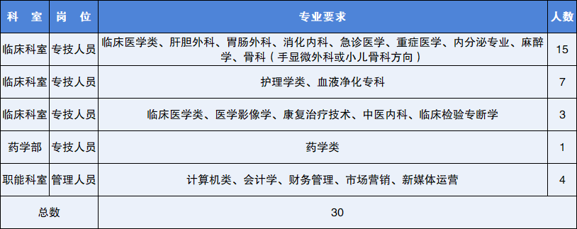 临床护理岗位学历要求为本科及以上,其余所有岗位原则上学历要求均为硕士研究生及以上,社会招聘中有相关工作经验的人员可适当降低条件;