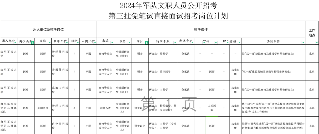 北部战区总医院,共 29 个岗位; 西部战区总医院,共 45 个岗位; 中部战区总医院,共 29 个岗位; 解放军总医院第二医学中心,共 21 个岗位; 解放军总医院第六医学中心,共 34 个岗位; 空军军医大学,共 118 个岗位; 联勤保障部队第九八八医院,共 13 个岗位; 联勤保障部队第九二〇医院,共 7 个岗位; 东部战区疾病预防控制中心,共 2 个岗位; 东部战区总医院,共 27 个岗位; 海军军医大学第二附属医院,共 11 个岗位; 海军军医大学第三附属医院,共 6 个岗位; 火箭军特色医学中心,共 8 个岗位; 解放军总医院,共 7 个岗位; 解放军总医院第八医学中心,共 7 个岗位;......